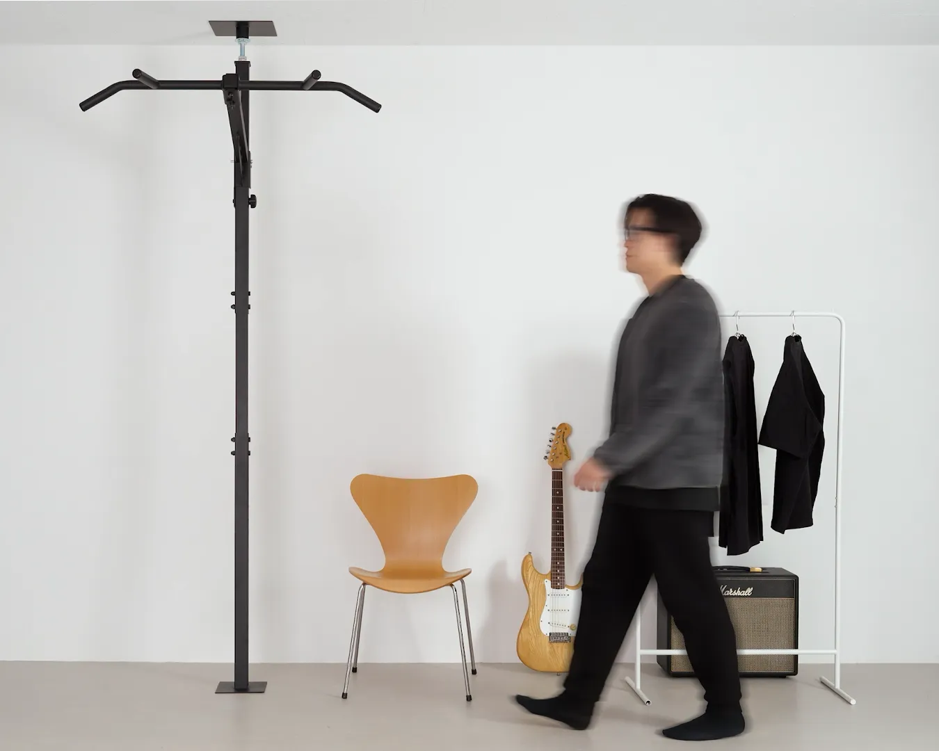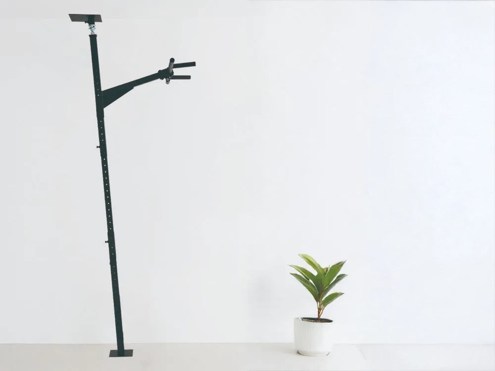 天井と床を突っ張るだけで簡単に設置ができます。ぶら下がっても手前に倒れないよう85度の傾斜角がついており、強く突っ張る必要はございません。もちろん工事も不要です。